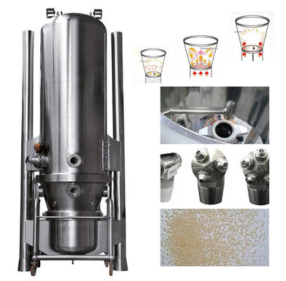 A máquina é um granulador multifuncional da cama fluida que integra várias funções tais como o pulverizador superior, o pulverizador inferior e o pulverizador lateral. Tem várias funções tais como a mistura, a secagem, a granulagem, o revestimento e a peletização. É amplamente utilizada em indústrias como farmacêutica, em alimento, na indústria química, etc.