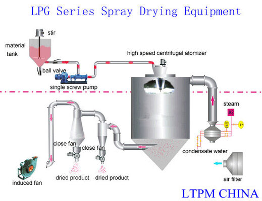 A secagem de pulverizador é a tecnologia usada a mais larga na tecnologia dando forma líquida e na indústria de secagem. O equipamento de secagem de atomização centrífugo (do pulverizador) é o mais apropriado para produzir o pó, as partículas ou produtos de bloco contínuos dos materiais da solução, da emulsão, do soliquoid e de estados pumpable da pasta.